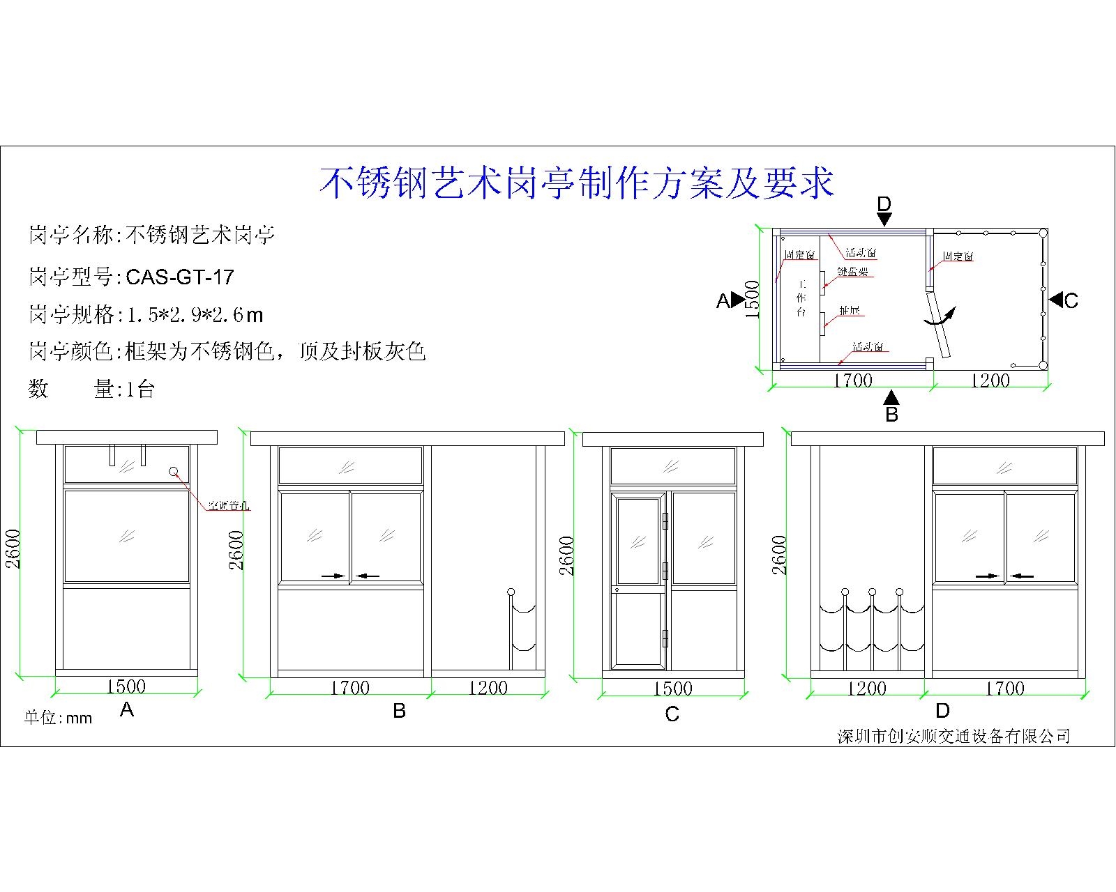 1、崗亭支撐柱采用優質不銹鋼板機械成模制作方通,美觀、堅固、耐用。