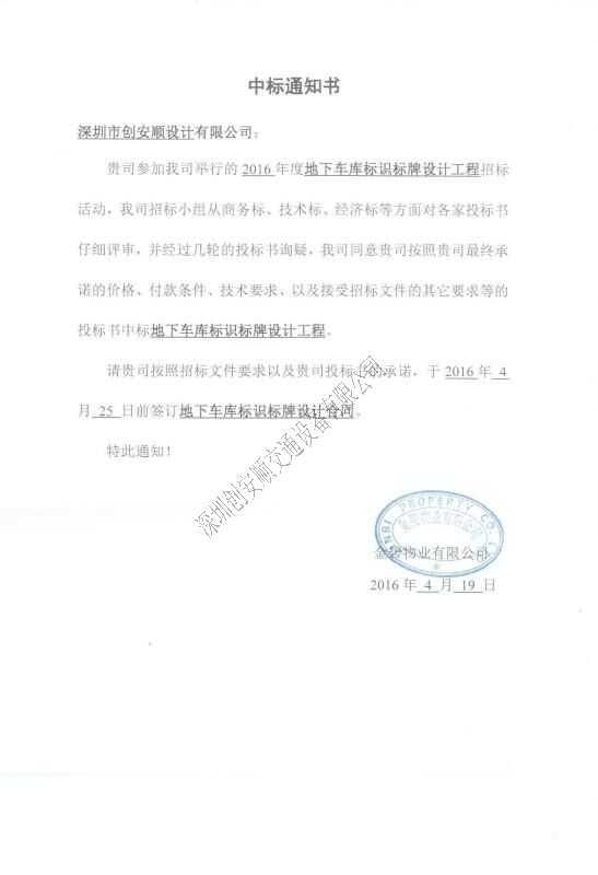 2016年4月,創安順應邀參加金碧物業舉辦的2016年度地下車庫標識標牌設計工程招標活動并成功中標,這是繼金碧物業舉辦的2015年度地下車庫標識標牌設計工程招標活動后,再次中標。