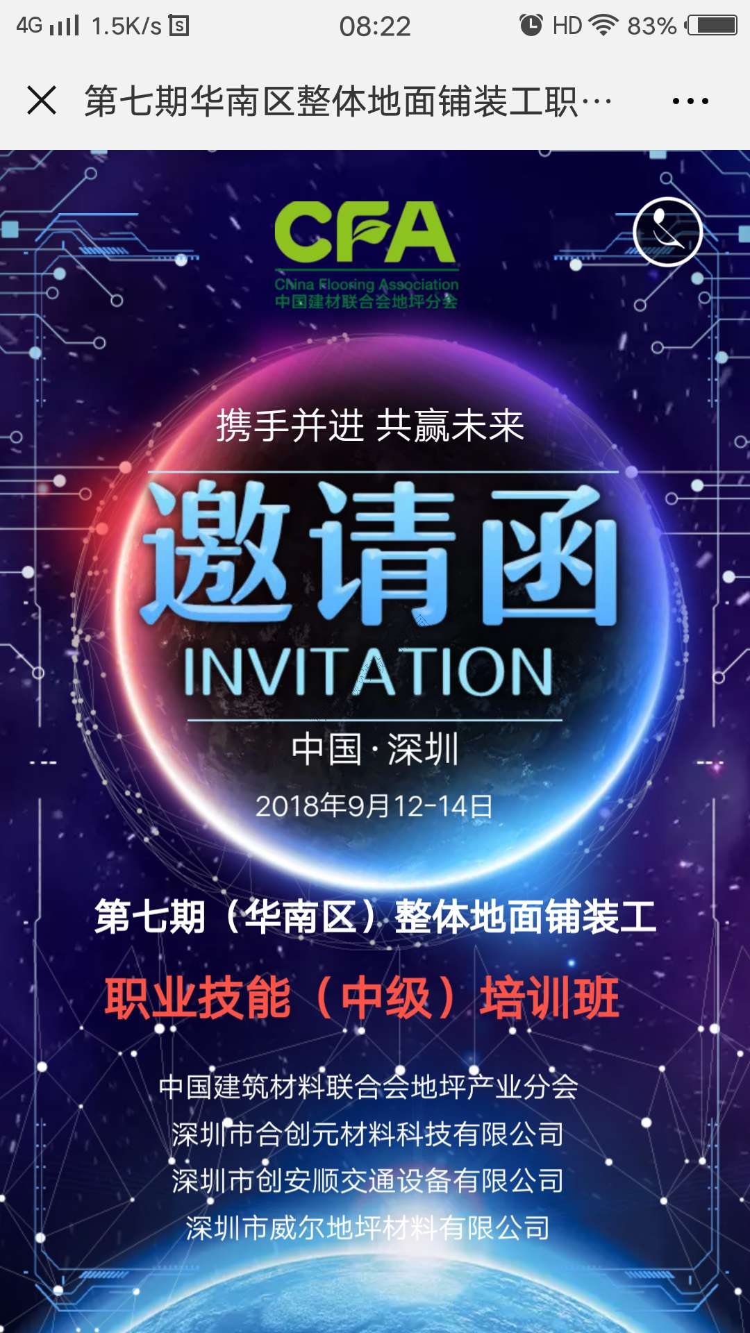 第七期(深圳站)整體地面鋪裝工職業技能(中級)培訓班由中國建筑材料聯合會地坪產業分會主辦,深圳市創安順交通設備有限公司、深圳市威爾地坪材料有限公司、深圳市合創元材料科技有限公司協辦,鼓勵地坪界有志之士參與,以引領地坪行業健康發展,幫助地坪施工企業及相關從業人員提高施工水平,做到規范施工,規范行業為宗旨的培訓活動。