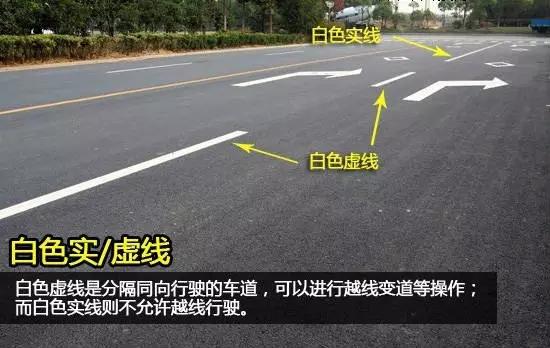 通常道路交通標線都以白色居多,其中白色虛線是分隔同向行駛的車道,可以進行越線變道等操作;而白色實線則不允許越線行駛,常常作為白色虛線的延長線在交叉路口前出現,或是分隔路邊的停車區域。