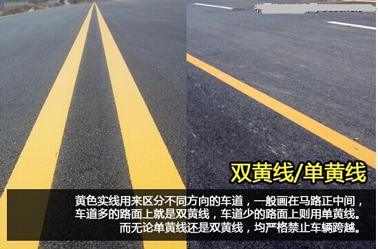 黃色實線用來區分不同方向的車道,一般畫在馬路正中間,車道多的路面上就是雙黃線,車道少的路面上則用單黃線。而無論單黃線還是雙黃線,均嚴格禁止車輛跨越,因此壓線行駛、超車或者掉頭等都是不允許的。一旦違規,就等著被罰款吧。