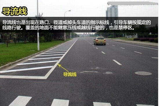 導流線也是出現在路口、匝道或掉頭車道的指示標線,引導車輛按規定的線路行駛。但很多駕駛者誤以為這是停車區域,其實導流線覆蓋的地面是不能隨意壓線或越線行駛的,也不能在區域內停車。 導向指示線
