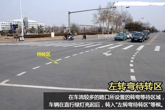 在車道較多,路面情況復雜的交通路口,為了提高機動車通過量,避免交通堵塞,常常會設立左轉彎待轉區,允許車輛在直行綠燈亮起后,轉入“左轉彎待轉區”等候。不過,如果在直行和左轉燈都是紅燈時進入待轉區,也將按闖紅燈計算。